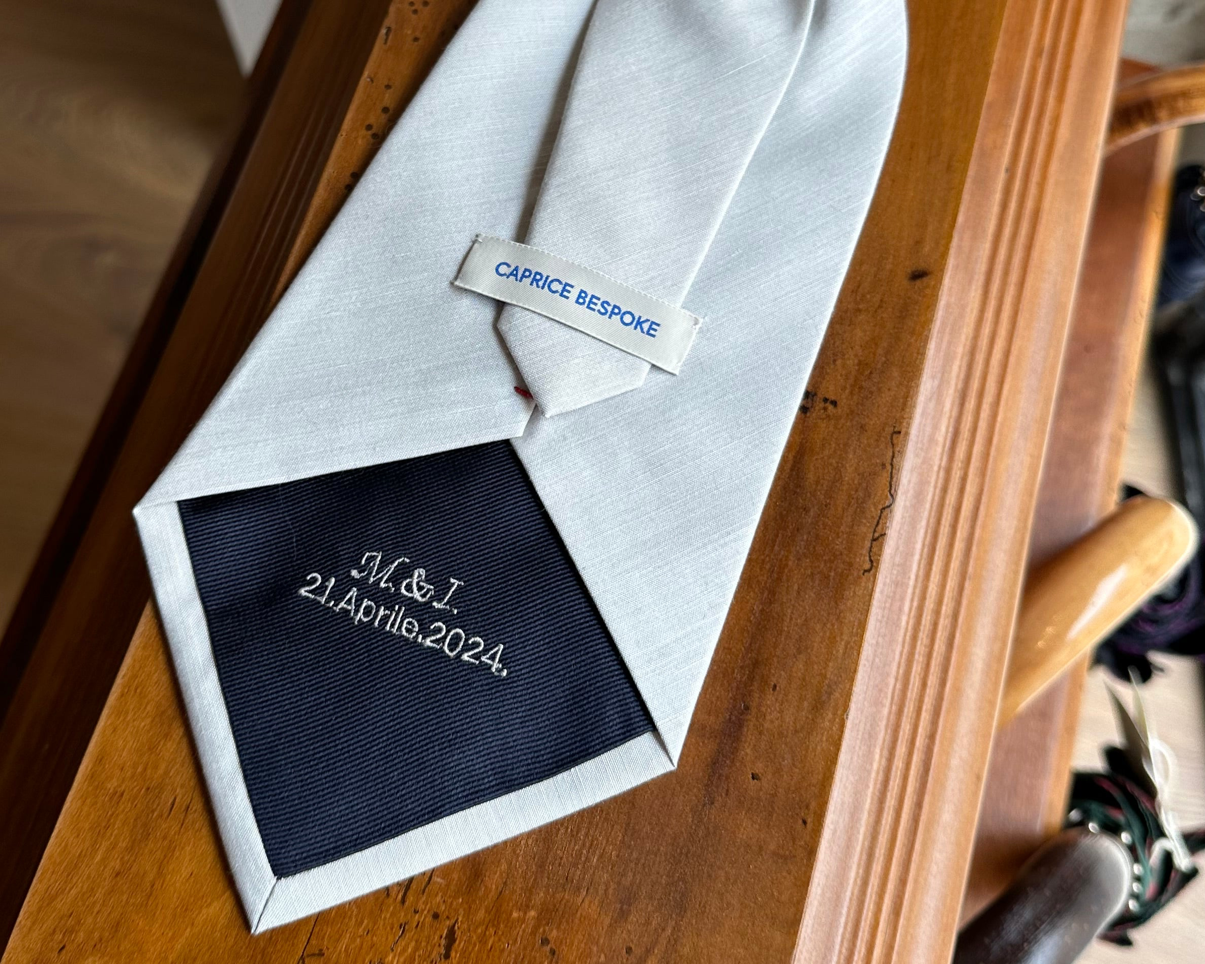 Made to ensure your wedding day is uniquely styled — down to the finest detail. Choose from custom ties, plastron, pocket squares, cufflinks and other finishing items embroidered or engraved with the couple’s initials, wedding date or bespoke motifs.