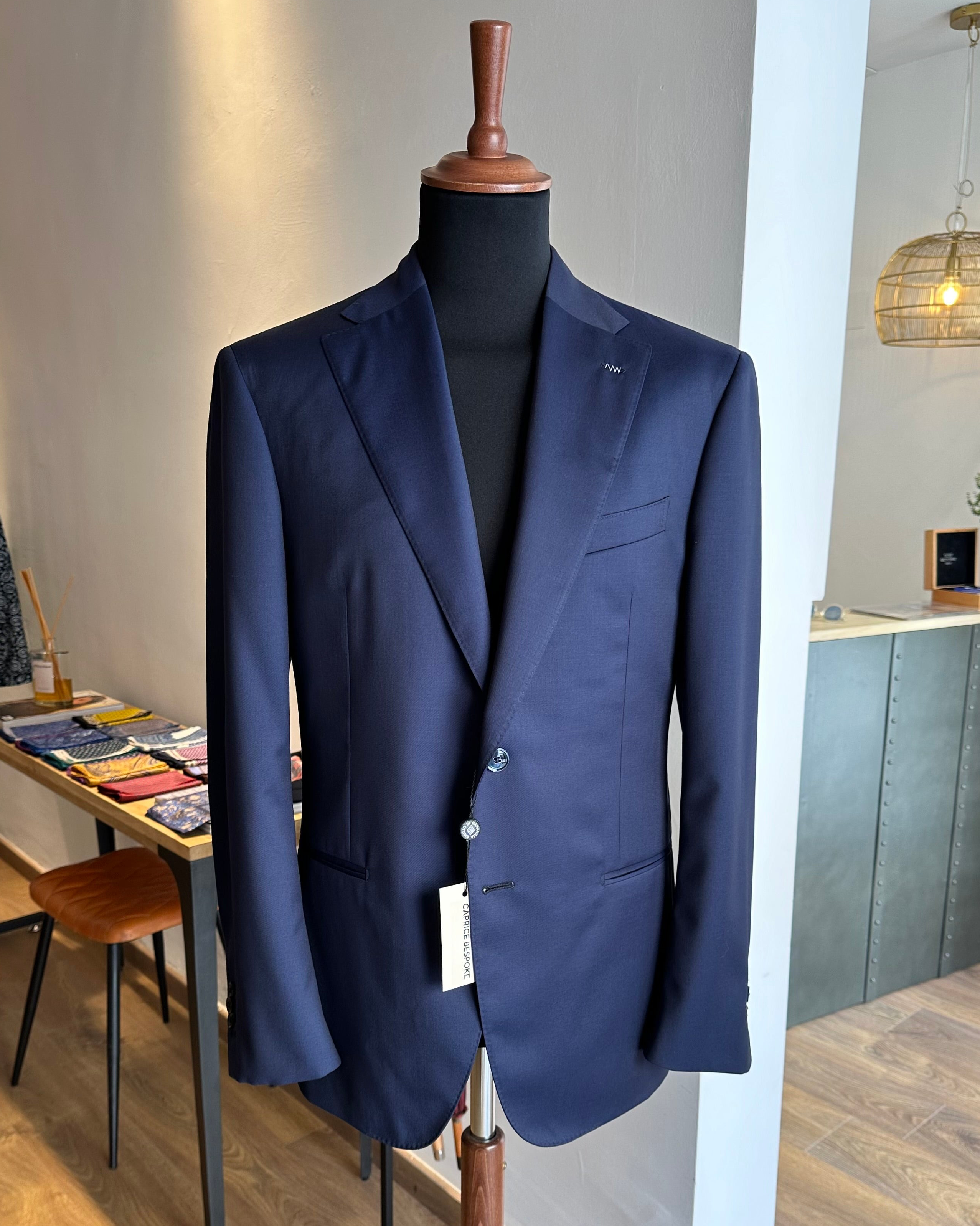 Typically tailored in shades of blue, from deep navy to lighter hues. Available in two- or three-piece configurations, with single-breasted cuts and fine details for sober elegance.